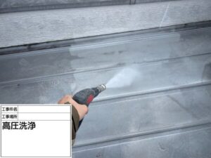 まずは高圧洗浄で剥がれてきている旧塗膜や、埃などの汚れを洗い流していきます。
