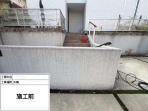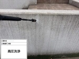 塗装に入る前に高圧洗浄を行い、外構塀に付着した汚れをしっかりと除去しています。