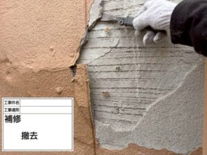 また、雨水が浸みて吸収してしまったことで、外壁材の中のモルタルごと膨らんでしまっていましたので、部分的に捲って下地から補修致します。