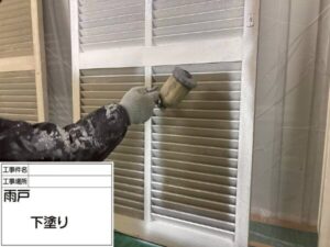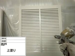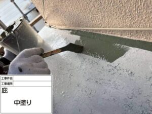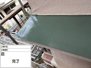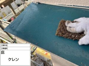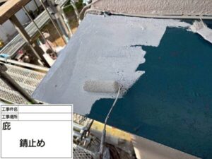 まずサビ止め機能の塗膜で覆ってから、仕上げに移ることで、雨水の溜まりやすい庇上を守ります。